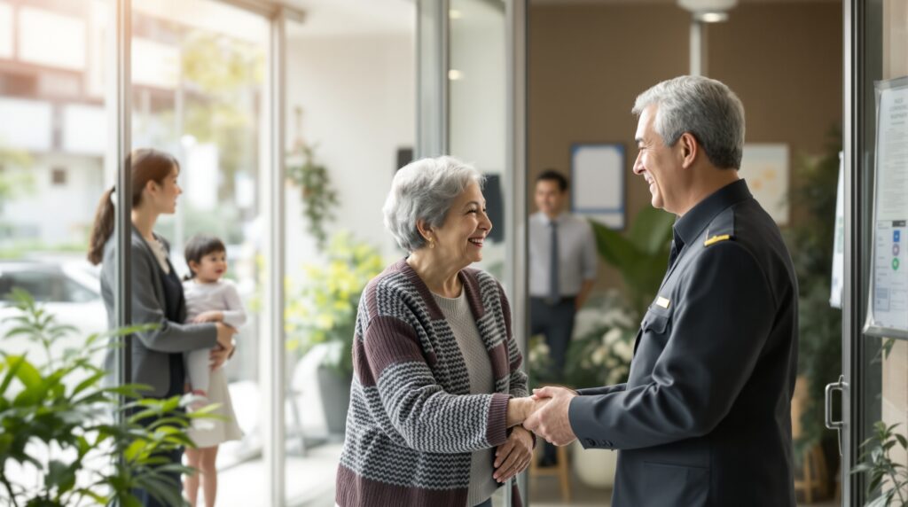 マンションの玄関で、デイサービスの送迎車を待つ担当者。
