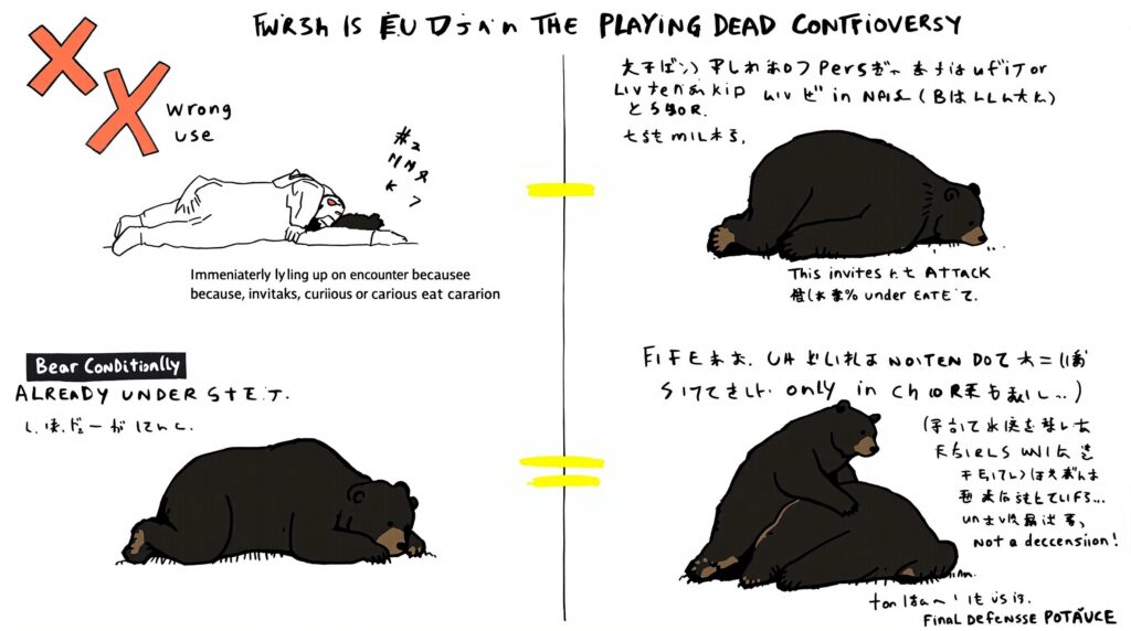 • 理由:それは「遭遇時」ではなく、「攻撃された時」の“防御姿勢”だから。クマに9回襲われて生還した専門家の米田一彦氏は、「死んだふりは有効だ」と主張しています。これは「遭遇時にやれ」という意味ではありません。もし、クマが(子熊を守るためなど)防衛的に突進してきて、攻撃が避けられない「最終フェーズ」に入った場合、下手に反撃するより「ある姿勢」をとった方が生存確率が上がる、という意味です 。