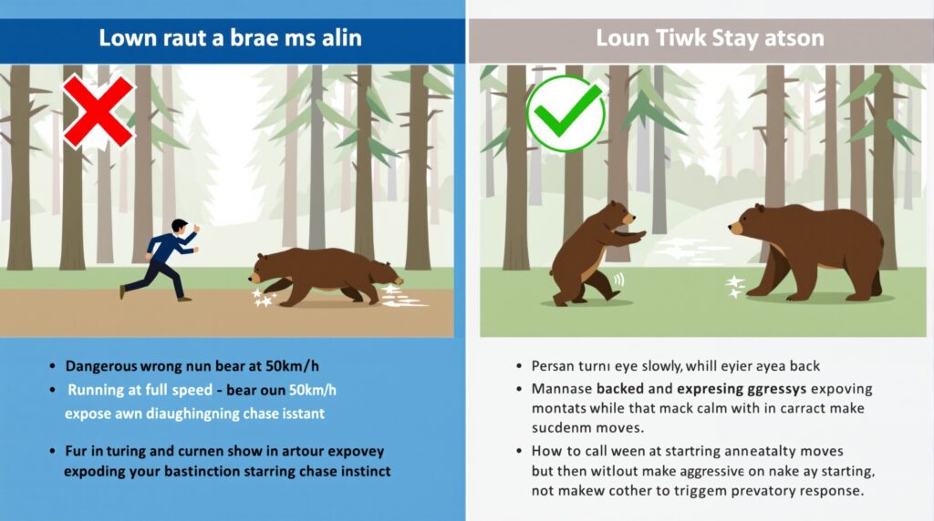 • 絶対NG行動①:全速力で逃げるダメです。クマには走るものを反射的に追いかける習性があります 11。クマは山道でも時速50km以上 11 で走れ、人間が逃げ切ることは不可能です 8。