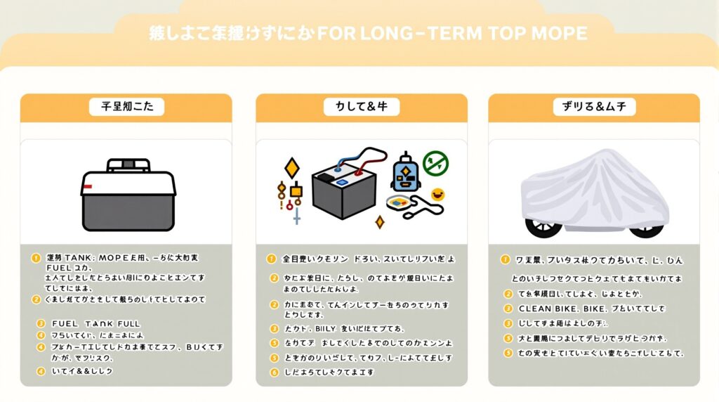 - ガソリンを満タンにする 意外かもしれませんが、タンクが空に近い状態で長期間放置すると、タンク内部が結露してサビが発生する原因になります 。サビがエンジンに回ると致命傷です。乗らない時こそガソリン満タンが基本です 。